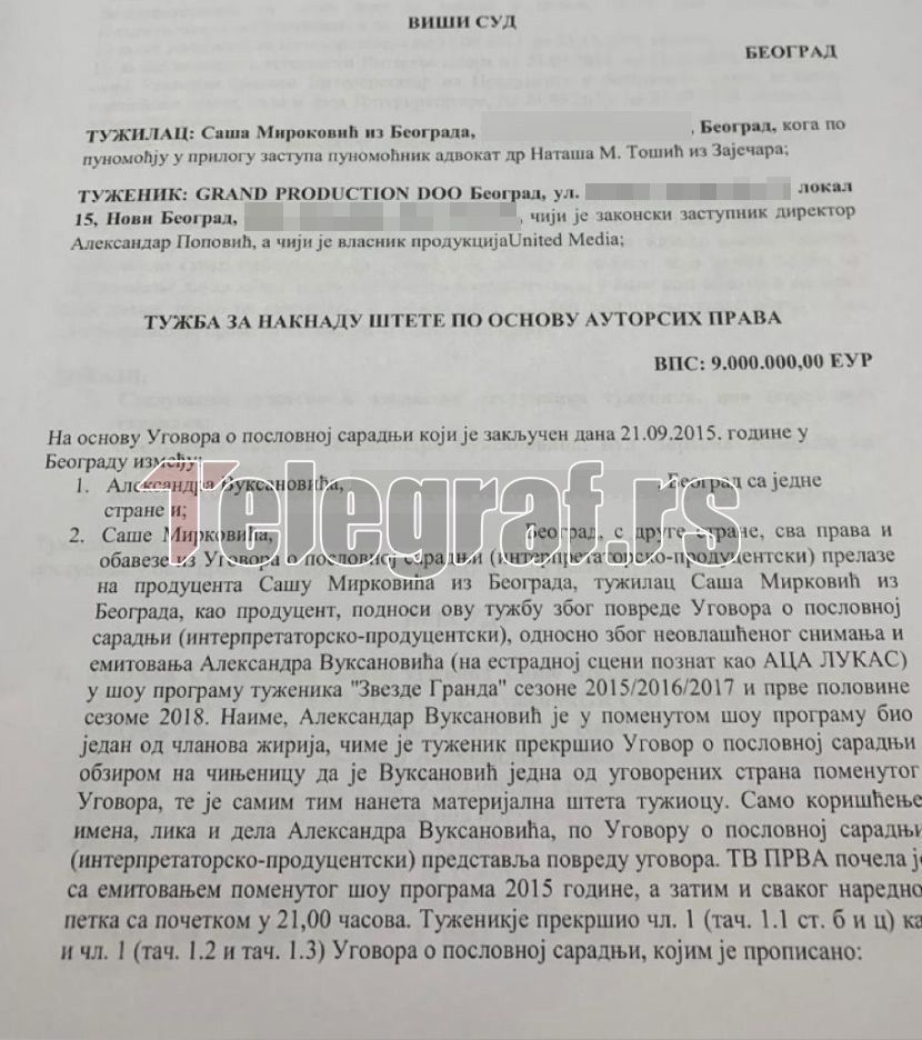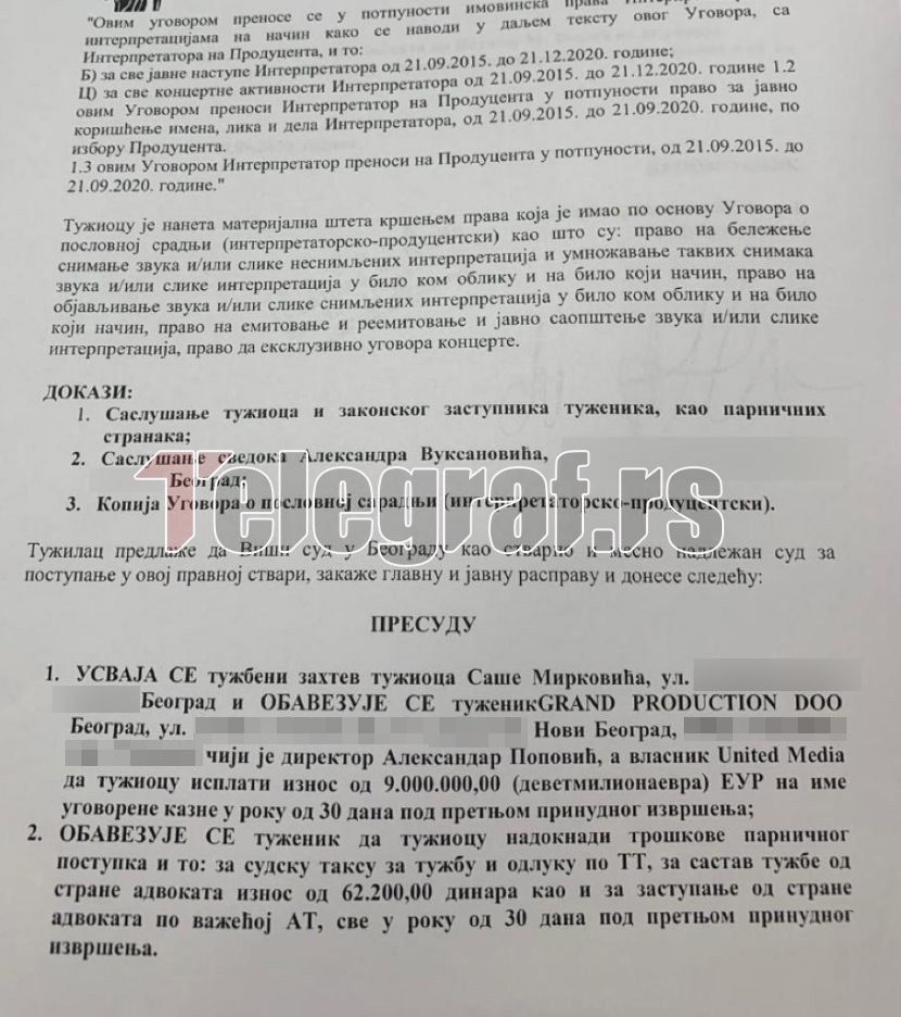 Уредничкиот одбор на нашиот портал ја доби горенаведената тужба со која Саша Мирковиќ предлага Високиот суд да ја прифати неговата тужба и да го закаже главното и јавното рочиште и да донесе пресуда со која Гранд продукција, односно Обединетите медиуми, ќе биде обврзана да му плати 9 000 000 (девет милиони) ) евра во рок од 30 дена под закана за извршување.