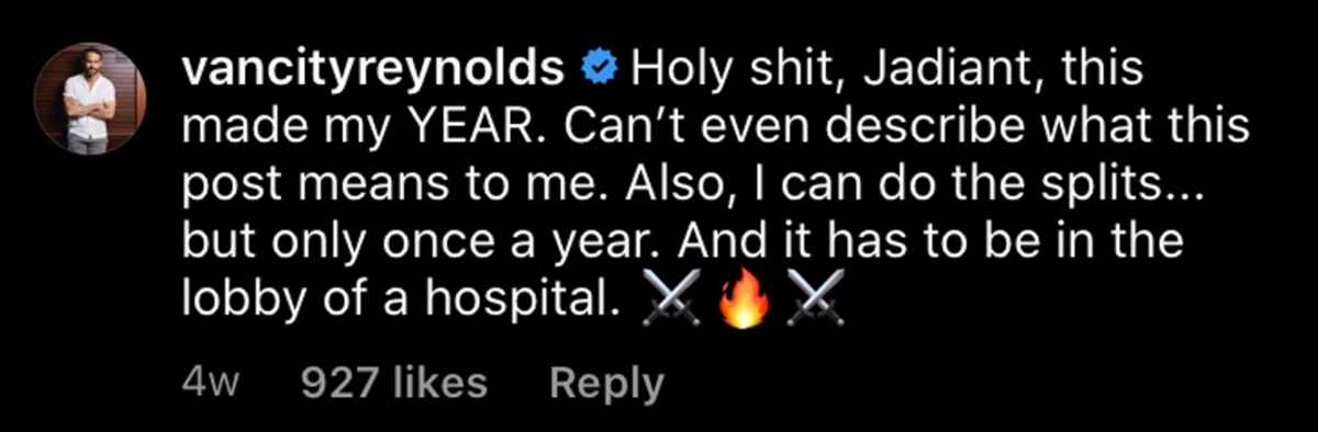 “Џони, ми ја разубави годината. Не можам да ви опишам што ми значи овој пост. Исто така, знам да направам шпага. Но, само еднаш годишно. И мора да биде во ходникот на болницата”, одговори Рајан во свој стил.