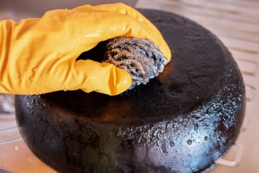 Процесот на чистење на задната страна на тавата е едноставен, но важно е да се остави доволно време смесата да делува на изгорените наслаги.