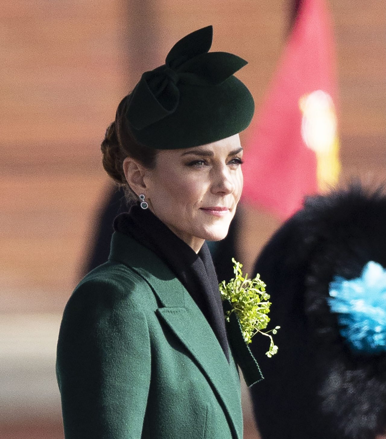 Додека темнозелениот волнен капут на Кејт од Александар Меквин и нејзините смарагдни и дијамантски обетки од 11.300 долари од Аспреј Лондон беа истакнати парчиња од нејзиниот изглед, нејзината коса, стилизирана под темнозелена филц шапка од Џина Фостер Милинери, не можеше да се занемари. Фризурата со плетенки потсетува на слична фризура што Кејт ја носеше во 2025 година кога присуствуваше на парадата за Денот на Свети Патрик.